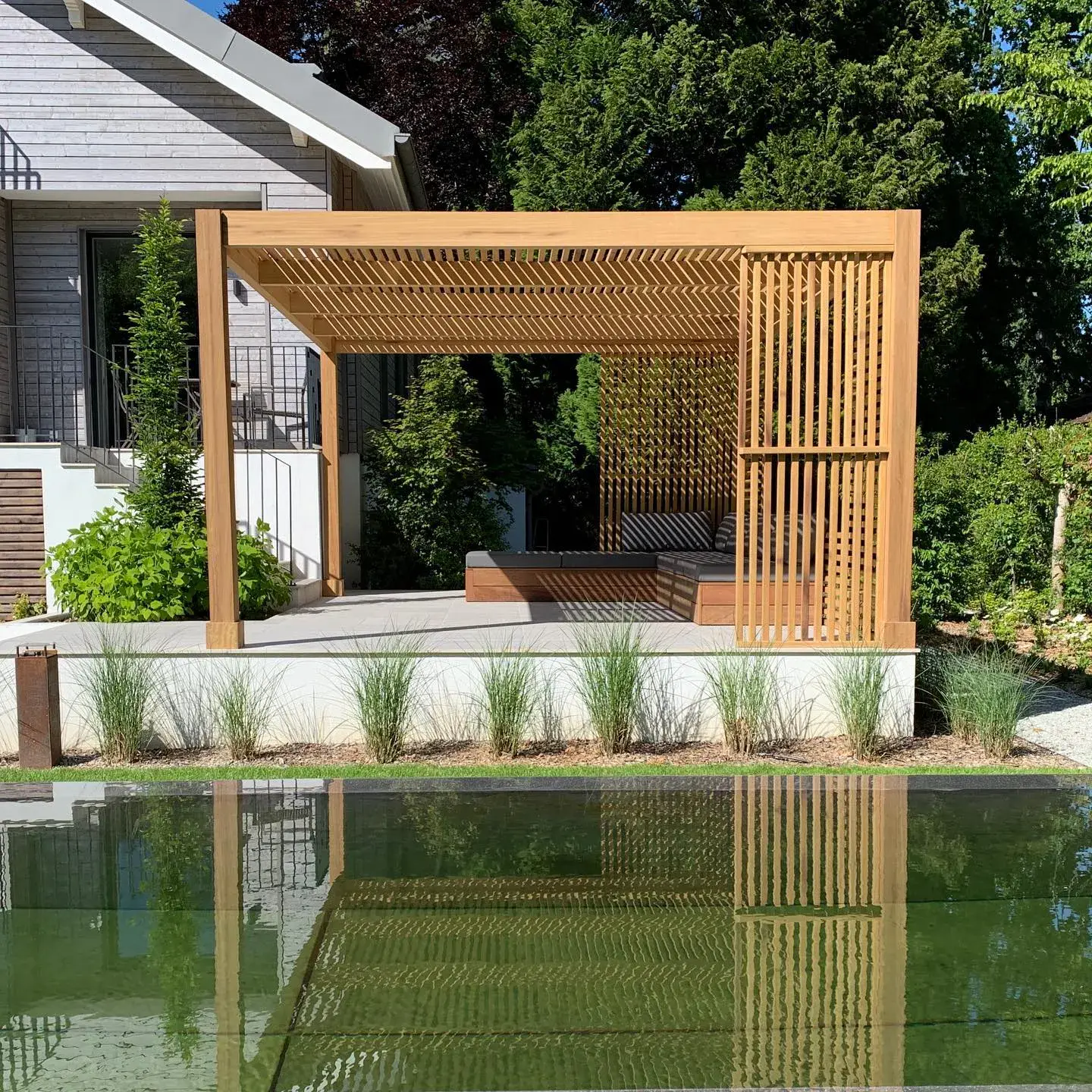 Grâce à sa structure et à ses lames en bois, la pergola bioclimatique en bois exotique permet de filtrer le soleil, de limiter l’éblouissement et de conserver une bonne circulation de l’air. Vous profitez d’une zone d’ombre confortable pendant les fortes chaleurs, tout en gardant une luminosité agréable dans votre intérieur.